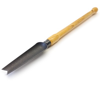 Кованый нож слегка наклонен на конце и имеет заточенную кромку. Потянув его горизонтально, он отсекает надоедливые корни сорняков. При повороте он пропахивает борозду и рыхлит почву.